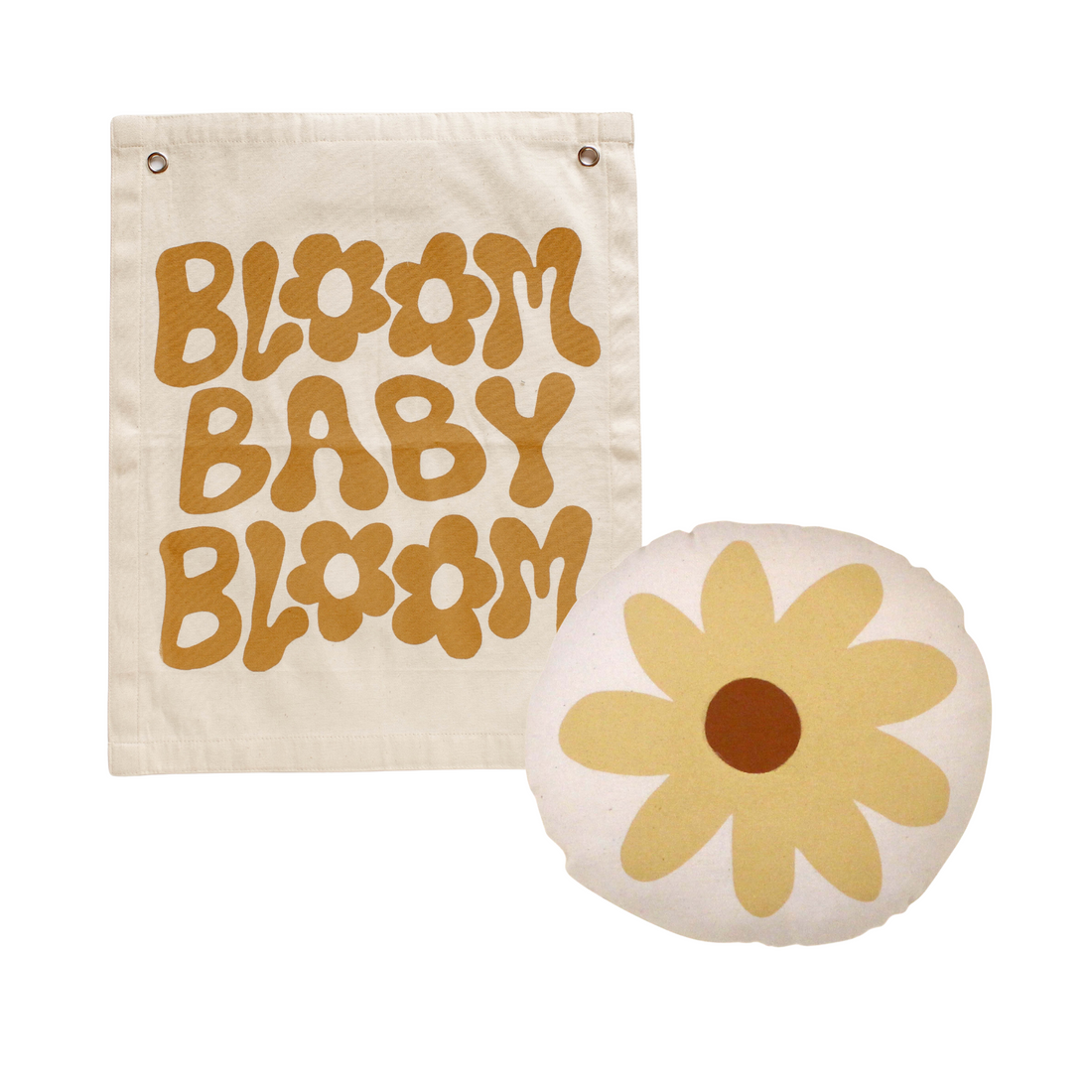 Transform your child's space into a haven of joy and growth with our Bloom & Blossom Bundle. This bundle features the Bloom Baby Bloom banner and the Daisy Pillow, each crafted by the skilled hands of Kenyan artisans using natural canvas.