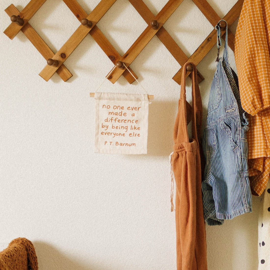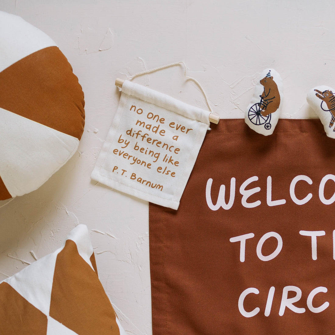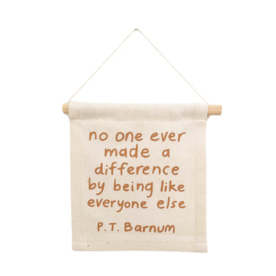 P.T Barnum on natural canvas hang sign with a wooden dowel.