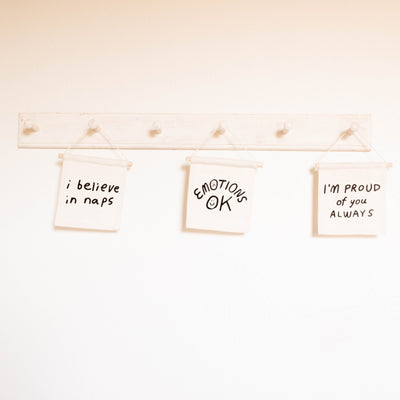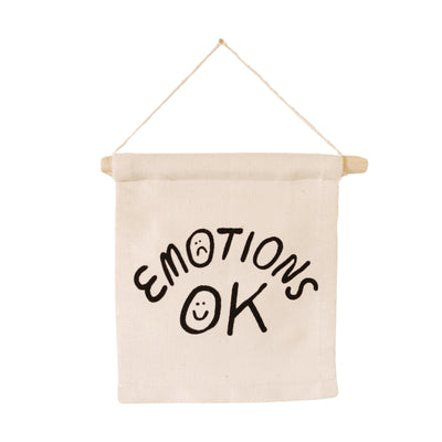 "Emotions OK" hang sign on natural canvas with a poplar wooden dowel.
