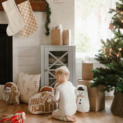 Our Interactive Gingerbread House PIllow is a soft canvas, screen printed pillow with one pockets. It comes with two mini plush pillows: a gingerbread person and candy cane. Each piece is sewn and screen printed by hand on natural canvas by local artisans.