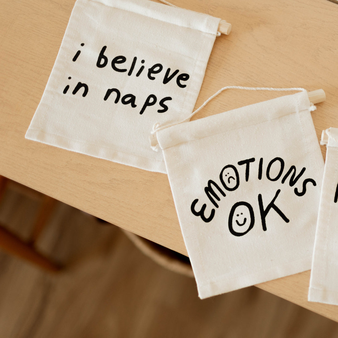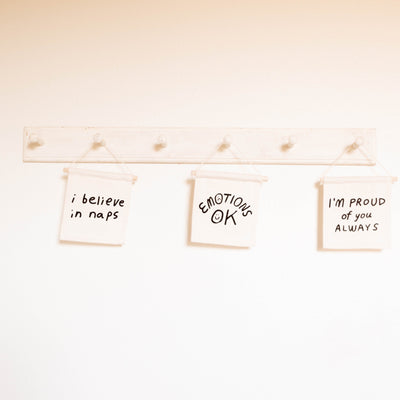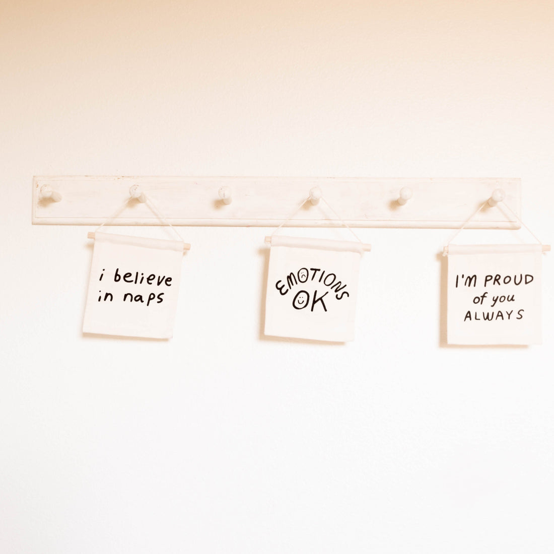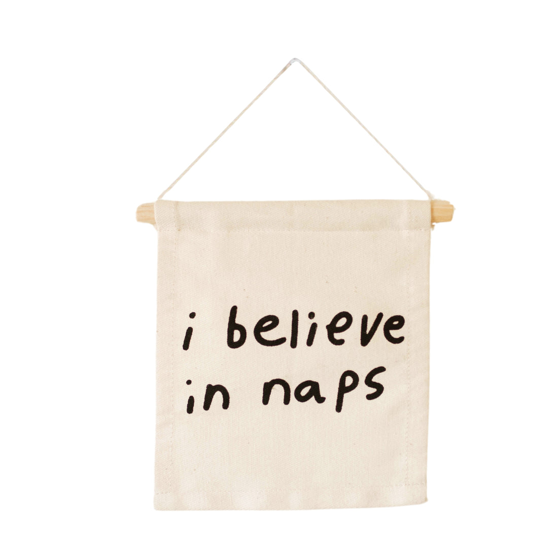 "i believe in naps" hang sign on natural canvas with a poplar wooden dowel.