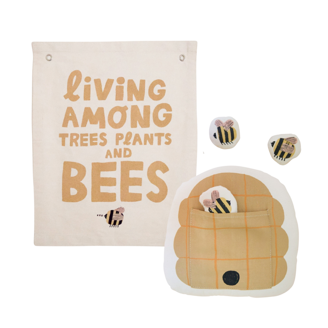 Step into a world of natural wonder and serene beauty with our Nature's Harmony Bundle. Thoughtfully curated to bring warmth and joy into your child's space, this set includes the Interactive Beehive Pillow and the Living Among Trees, Plants and Bees Banner.