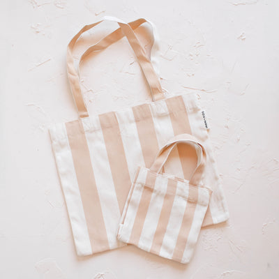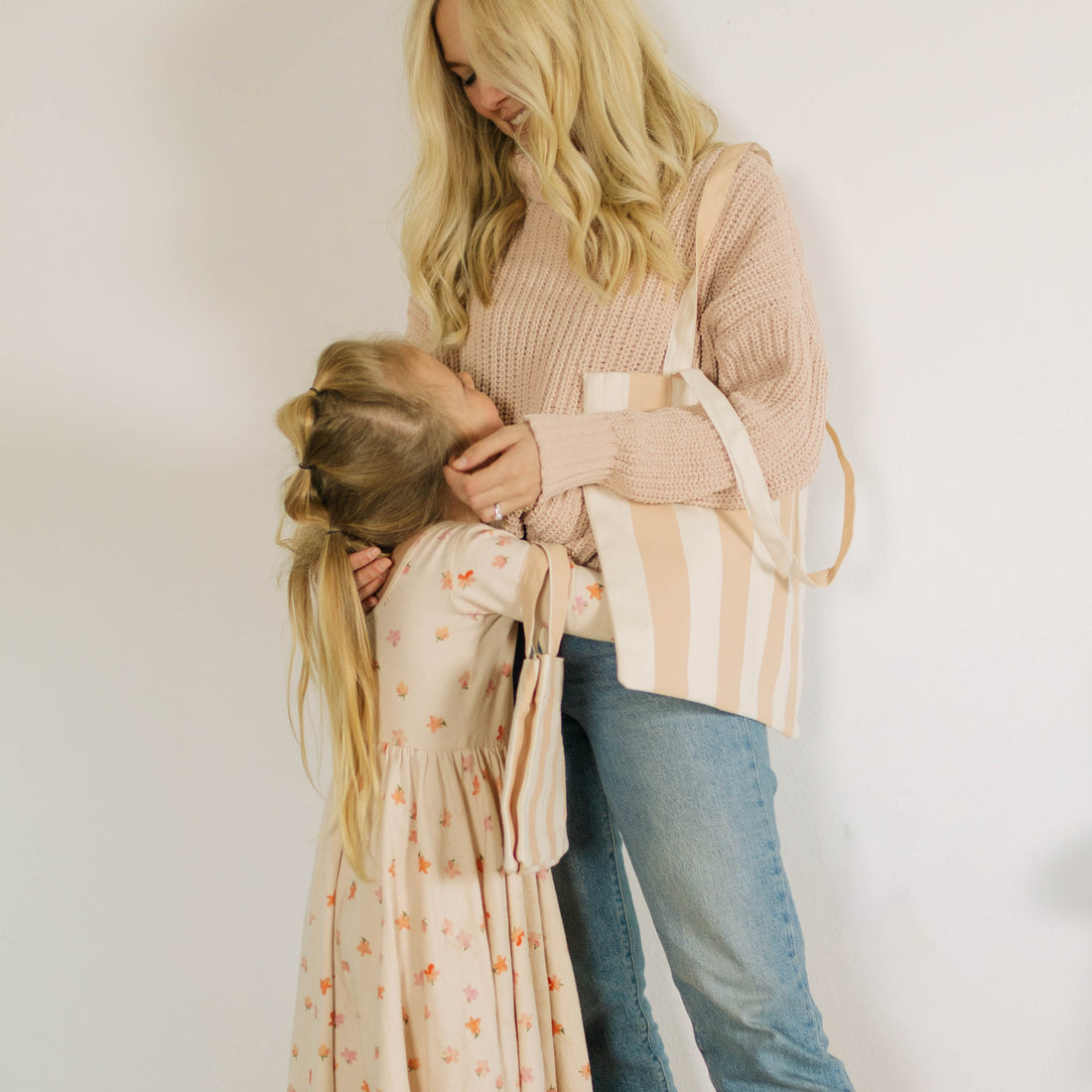 Perfect for dates with your little, our mommy + me tote is a great size for little hands. Sewn and screen printed by hand on natural canvas by local artisans in Mombasa, Kenya.