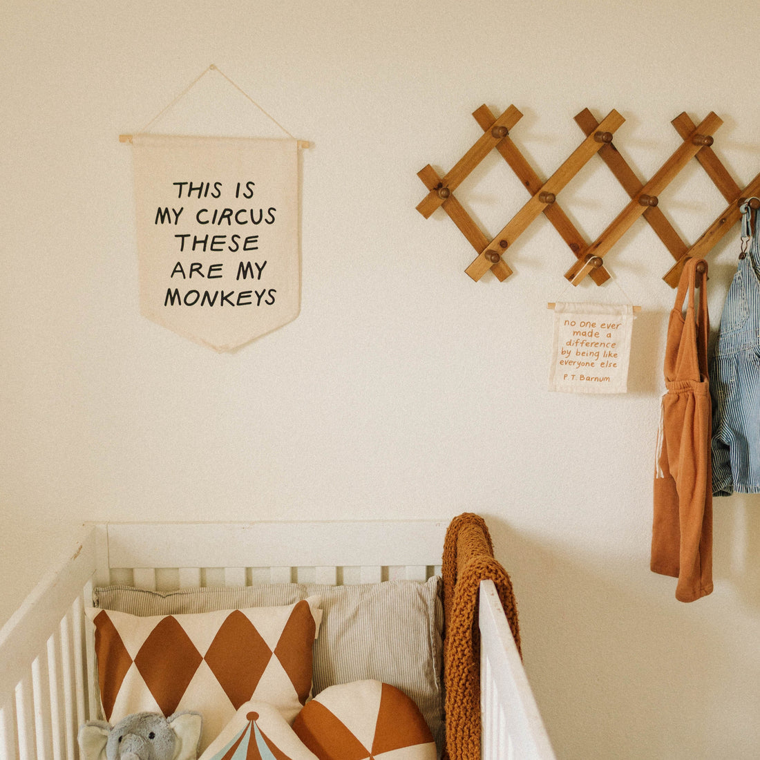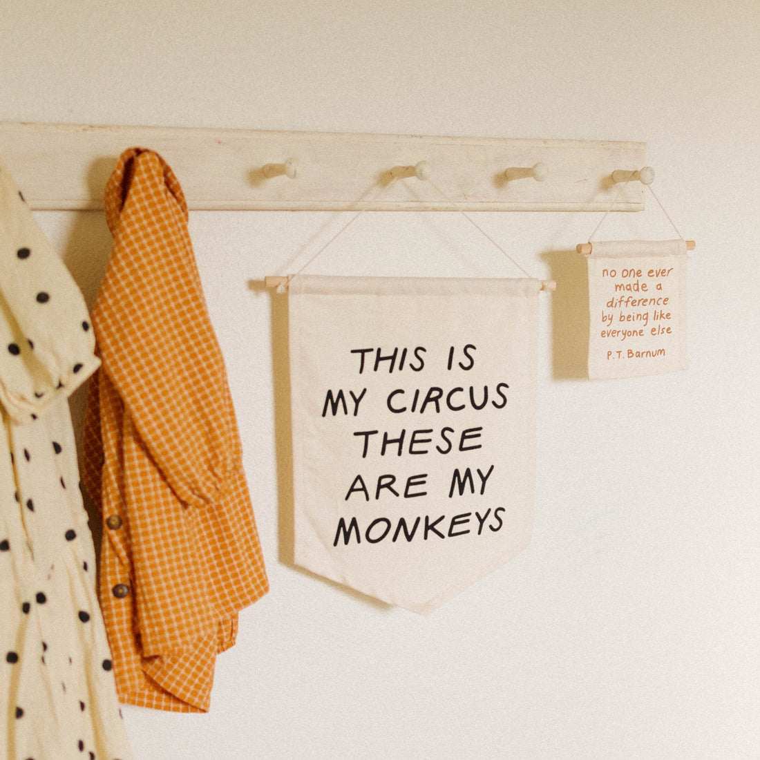 This is my circus on natural canvas hang sign with a wooden dowel.
