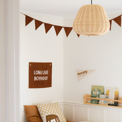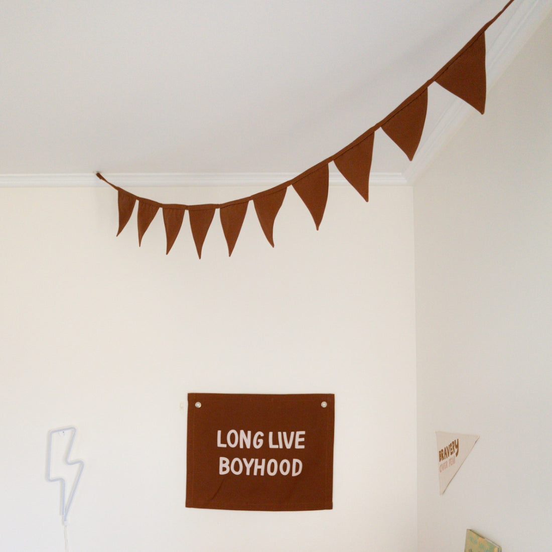 Triangle canvas bunting perfect for birthdays + parties or for keeping up in your kids rooms or nurseries all year long! Available in natural canvas and rust canvas. Made by empowered artisans in Mombasa, Kenya.