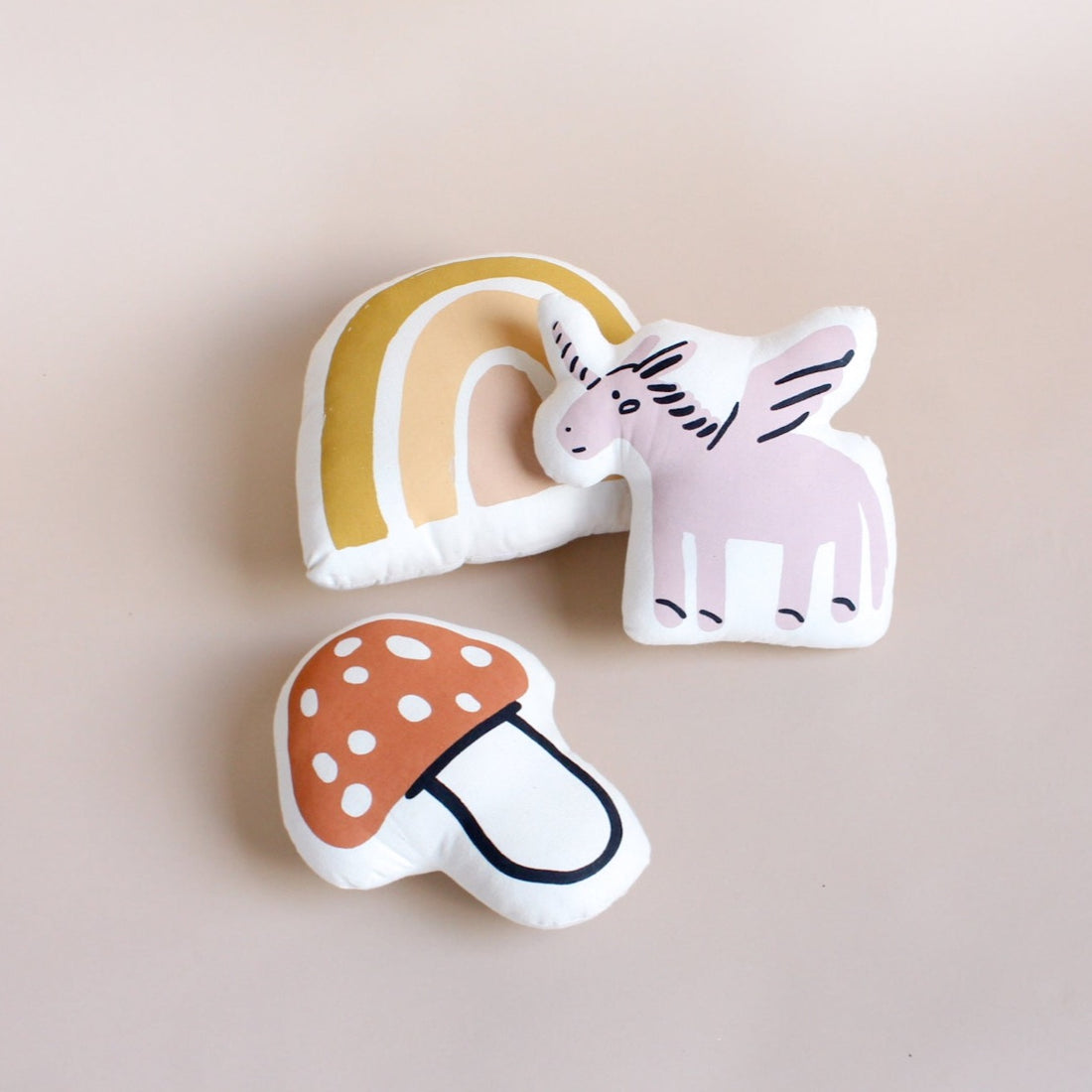 Unicorn Pillow. Sewn and screen printed by hand on natural canvas by local artisans.